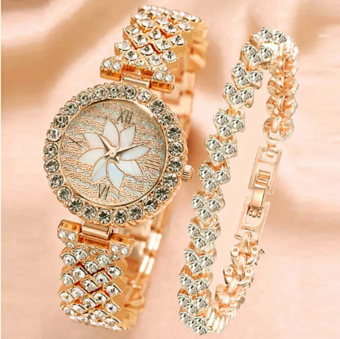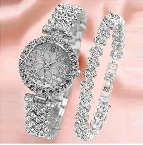 A stylish and elegant 2-piece set featuring a beautifully crafted quartz watch with a matching bracelet. Designed with a delicate flower motif, this set is perfect for both everyday wear and special occasions.
