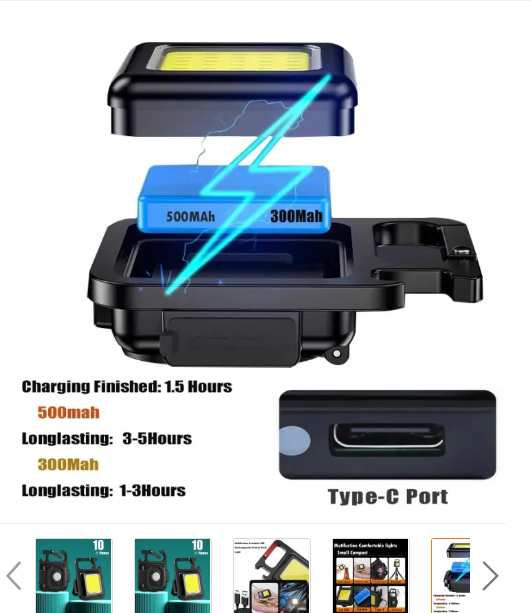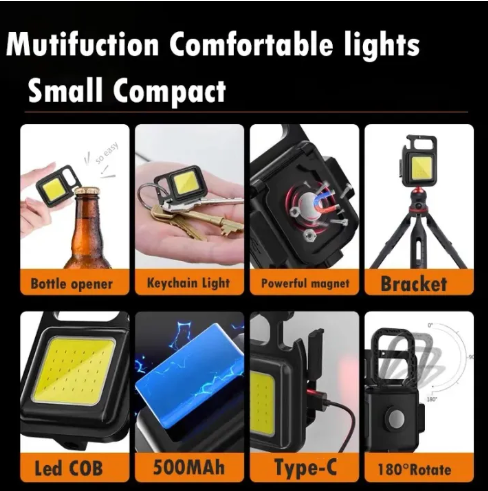 This mini LED keychain flashlight is more than just a torch – it serves as a portable COB work light, USB rechargeable camping lamp, emergency light, and handy outdoor lantern. Perfect for camping, fishing, hiking, and everyday use.