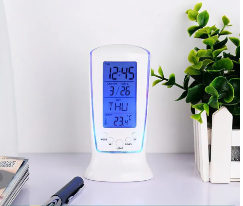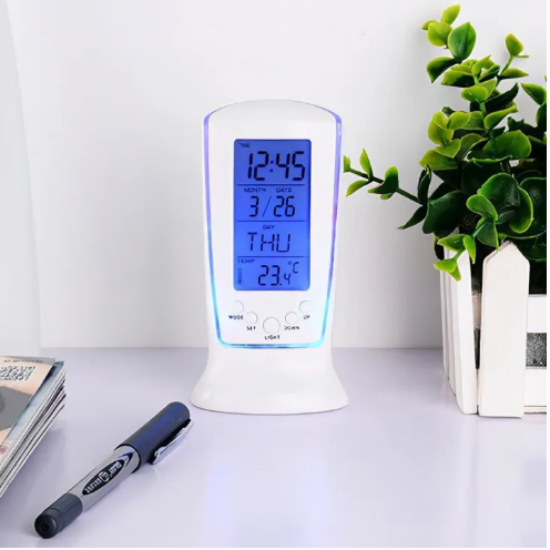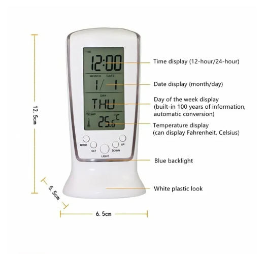 Features an LCD screen showing the time, date, and room temperature—your perfect bedside or desk companion. -